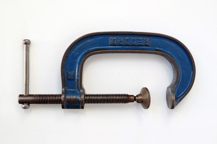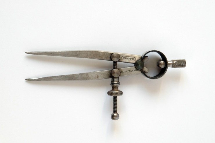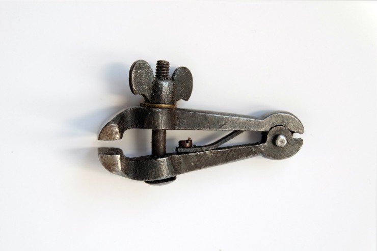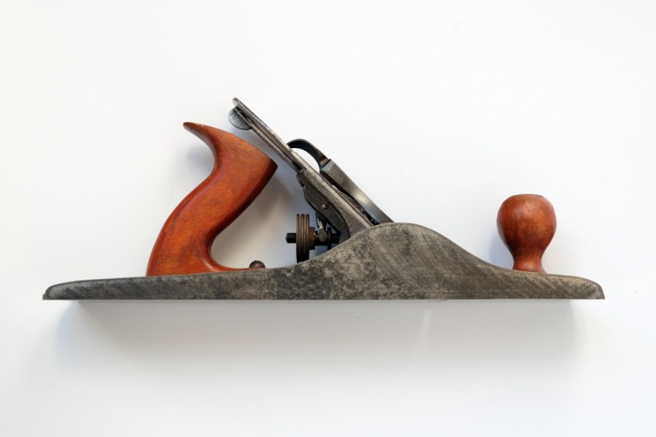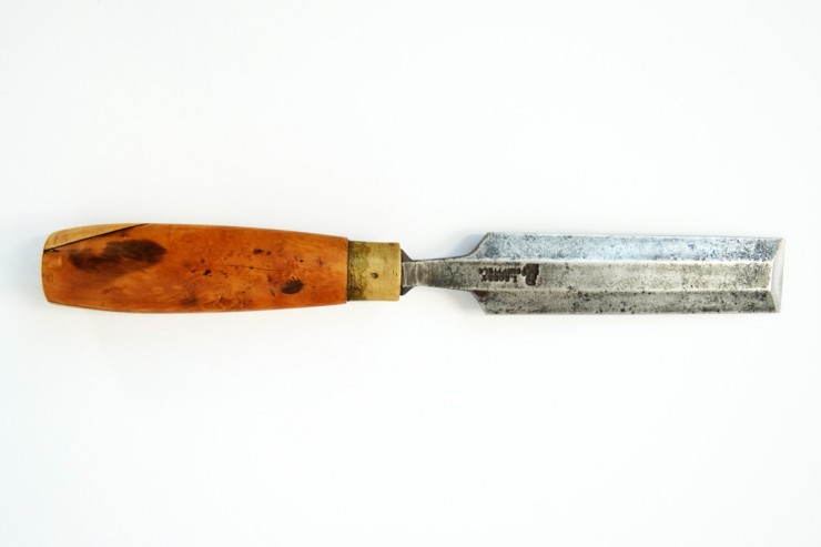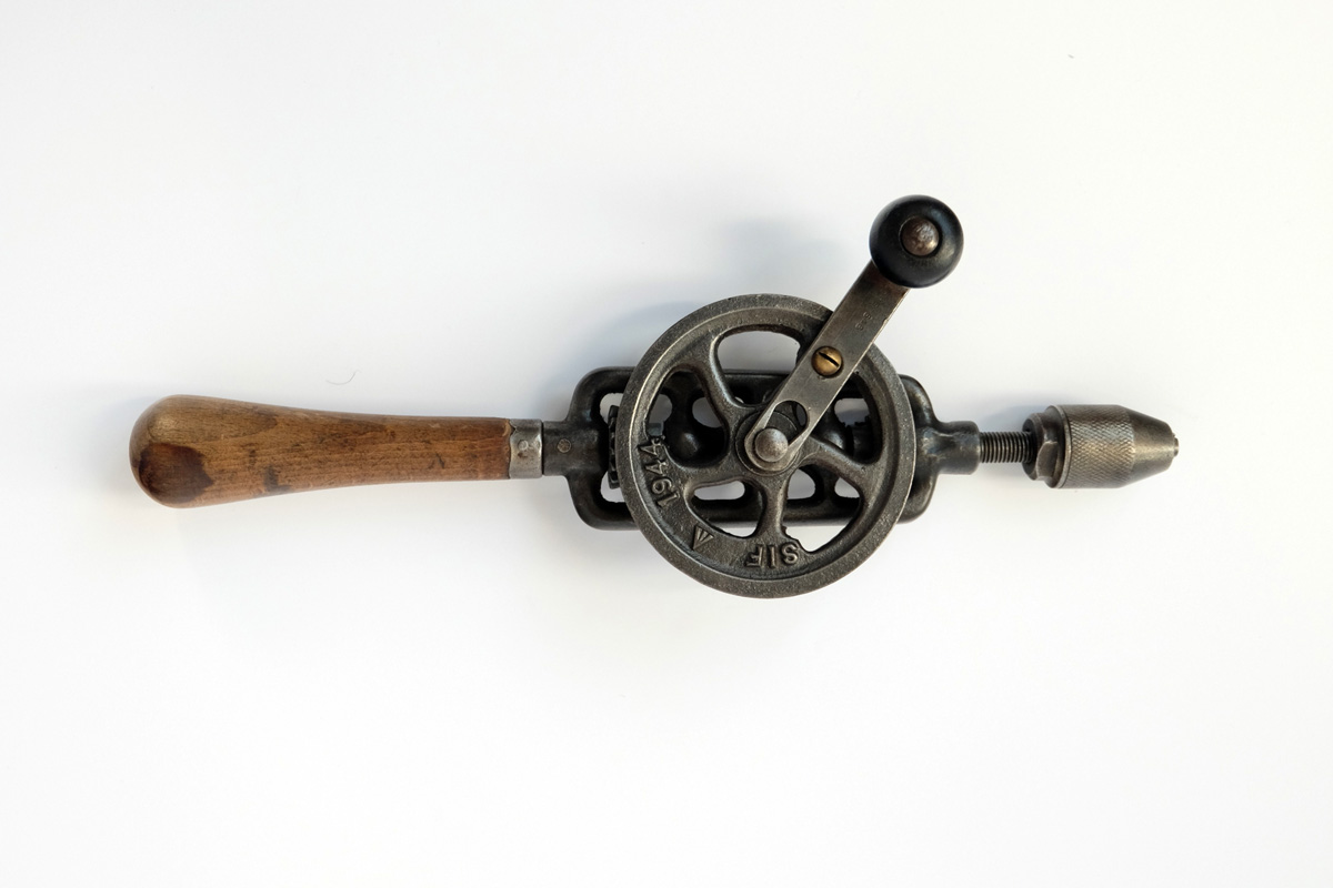 De gauche à droite: un rabot noisette, un serre-joint, une chignole de 1944, un rabot demi-varlope, un étau à main, une fausse équerre, un compas d’épaisseur et un ciseau à bois.